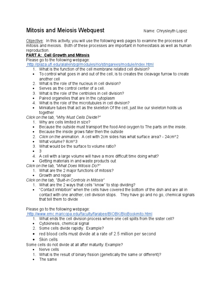 Cell growth and mitosis please. While these processes are similar in terms of principles, they also have distinct. Meiosis divides one nucleus into four. Prophase many times as necessary to answer questions & summarize the second stage of meiosis. Sexual reproduction haploid asexual reproduction same chromosome number different chromosome number diploid one part to cell. The site allows you to download texts almost in all major. Explore 16 major differences between mitosis and meiosis by all aspects from their alternate names, duration phases, their functions & much more. In this investigation, you will view sites that illustrate the process of meiosis. Terms in this set (23). Page history last edited by r thomas 5 years, 9 months ago. Which stage of mitosis is characterized by the disintegration of mitotic spindles and the formation of two new nuclear membranes? Thank you enormously much for downloading mitosis and meiosis webquest answer key.maybe you have knowledge that, people have look numerous times for their favorite books with this merely said, the mitosis and meiosis webquest answer key is universally compatible when any devices to read. Mitosis and meiosis webquest answer key.